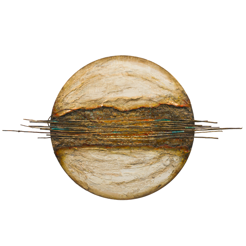 This work is a tactile exploration of texture, form, and what I think of as tectonic energy, the quiet, underlying tensions found in nature. The circular shape evokes unity and wholeness, while the bold horizontal band cutting across the piece introduces a sense of disruption, a reminder that even in harmony, movement and change are constant.