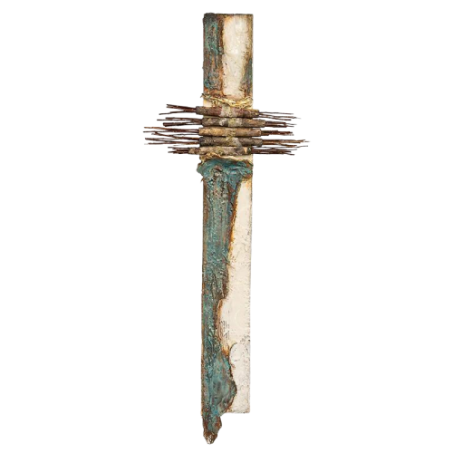 The cross at the heart of this piece carries both symbolic weight and personal resonance, anchoring the work while inviting reflection. Layered textures, intertwined rope-like strands, and earthy tones create a tactile landscape that is at once grounded and alive. Warm hues in the center draw the eye inward, offering a sense of energy, comfort, and the quiet pulse of life within the rugged exterior.